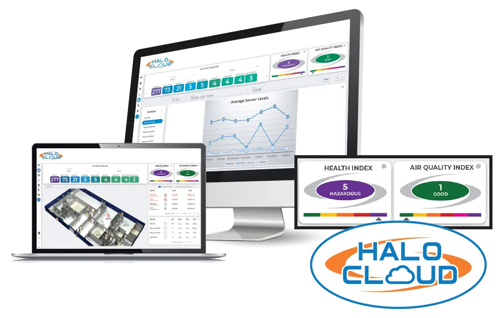 HALO is the essential component in the solution to providing a low-risk, healthier environment by monitoring Carbon Dioxide (CO2), Particulate concentrations, Humidity, Volatile Organic Compounds (VOC), and Nitrogen Dioxide (NO2) in the air.